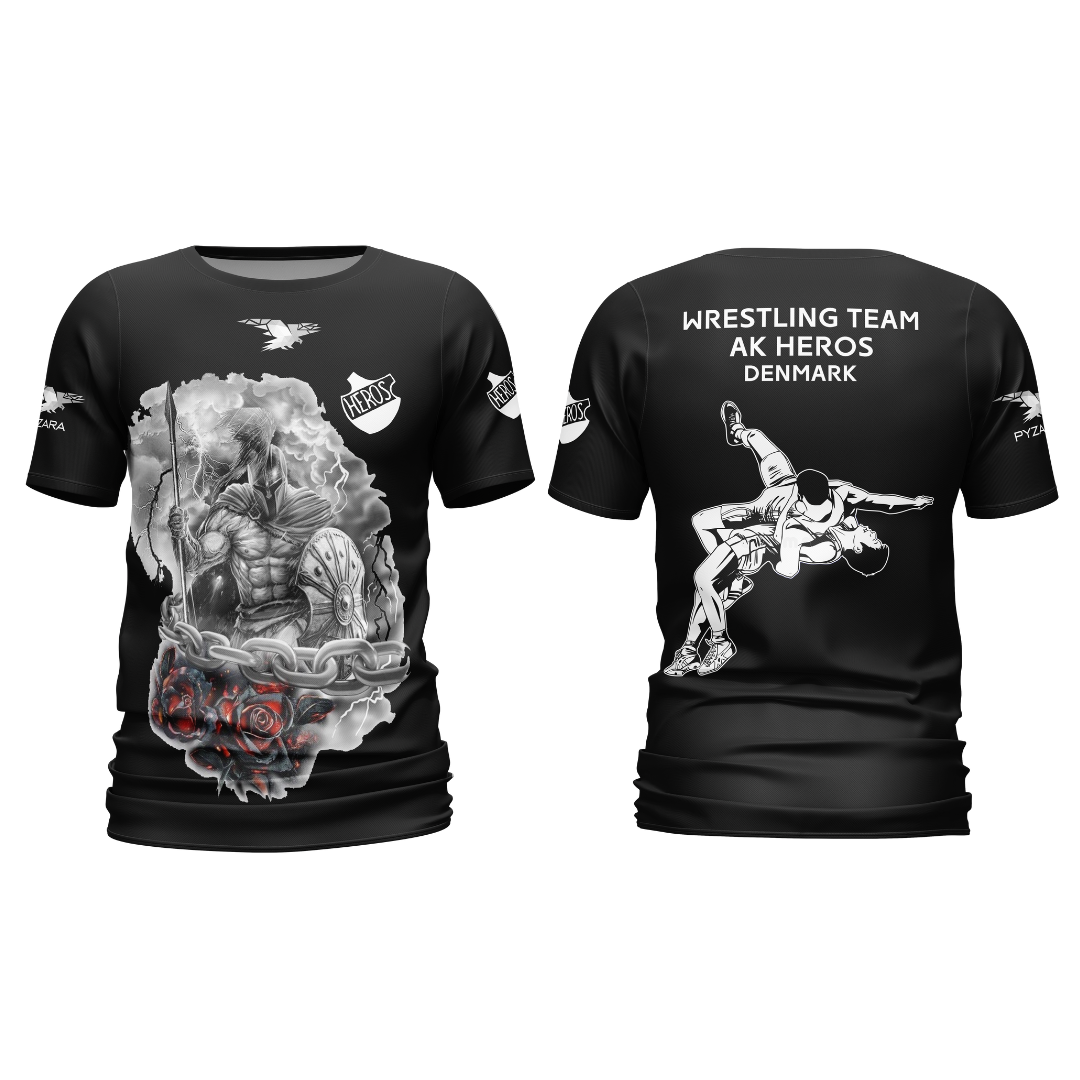 AK Heros har i samarbejde med Pyzara fået udarbejdet én klubtrøje efter eget ønske. Foran ses et portræt af en gladiator, hvilket matcher brydeklubbens brydetrikoter. På ryggen ses et billede af et klassisk brydekast.
